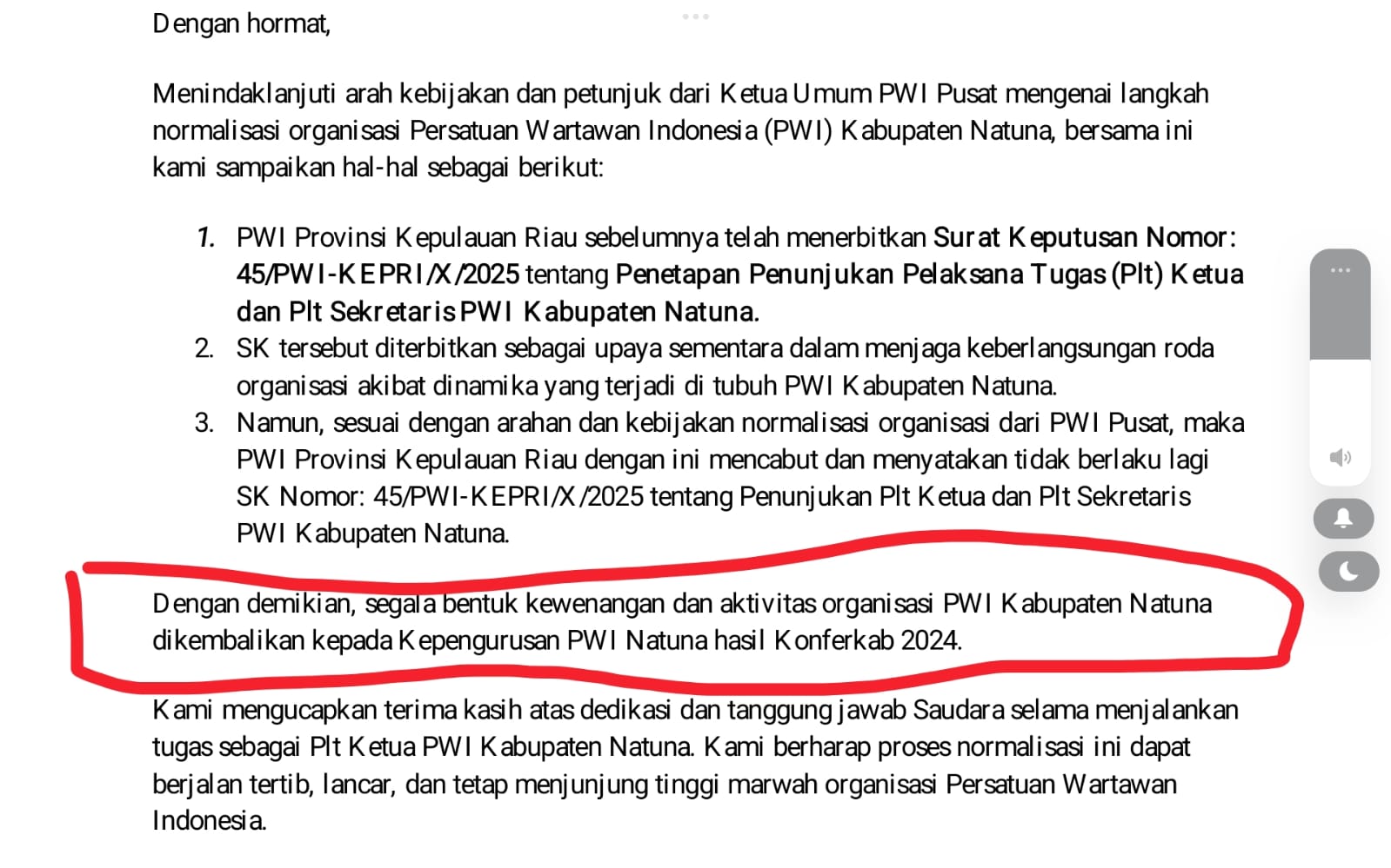 Keputusan tersebut tertuang dalam surat resmi PWI Kepri tertanggal 30 Oktober 2025, yang diterbitkan berdasarkan arahan PWI Pusat. Surat bernomor 47/PWI-KEPRI/X/2025 itu baru diterima pada Januari 2026 oleh Muhammad Rapi, yang dengan demikian kembali sah menjabat sebagai Ketua PWI Natuna.