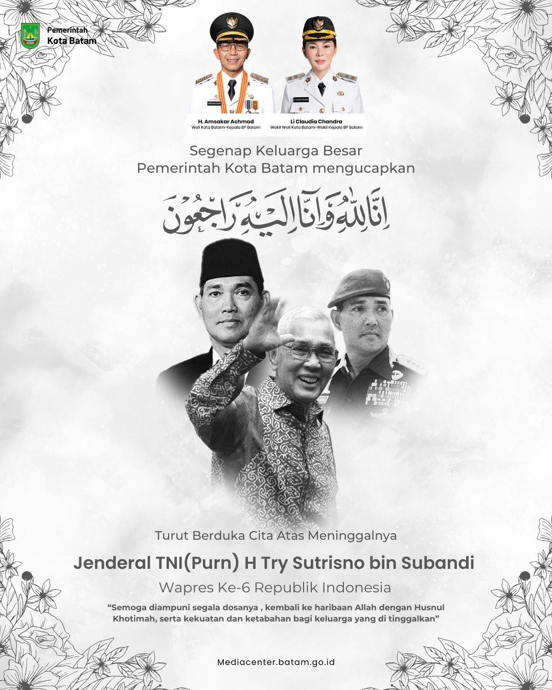 “Atas nama Pemerintah Kota Batam dan seluruh masyarakat, kami menyampaikan duka cita yang mendalam atas wafatnya Bapak Try Sutrisno. Semoga almarhum mendapat tempat terbaik di sisi Tuhan Yang Maha Esa dan keluarga yang ditinggalkan diberikan ketabahan,” ujar Amsakar, Senin (2/3/2026).